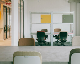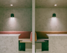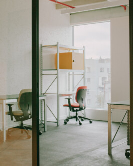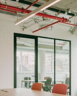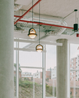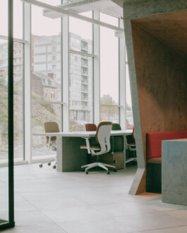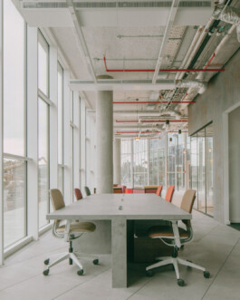 The architecture of this new coworking space designed by NAÏF embraces raw, unfinished materials, featuring exposed pipes, and polished concrete desks. High ceilings and large factory-style windows flood the space with natural light, creating an airy, open environment.